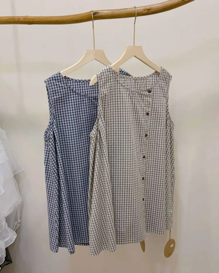 日系經典小格紋側開釦無袖背心