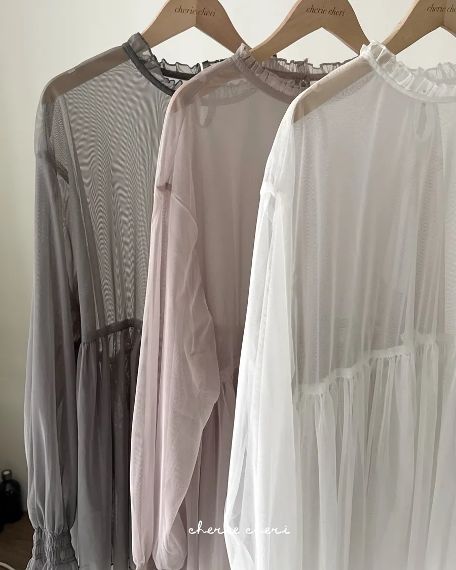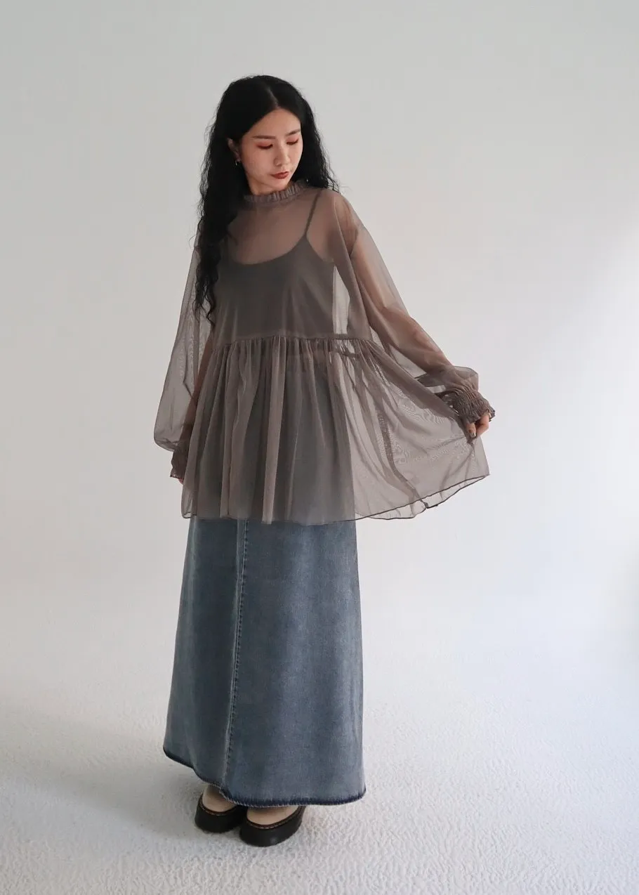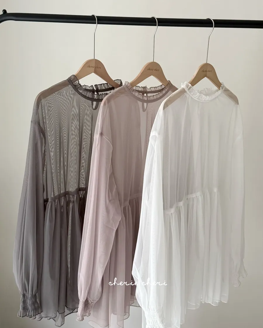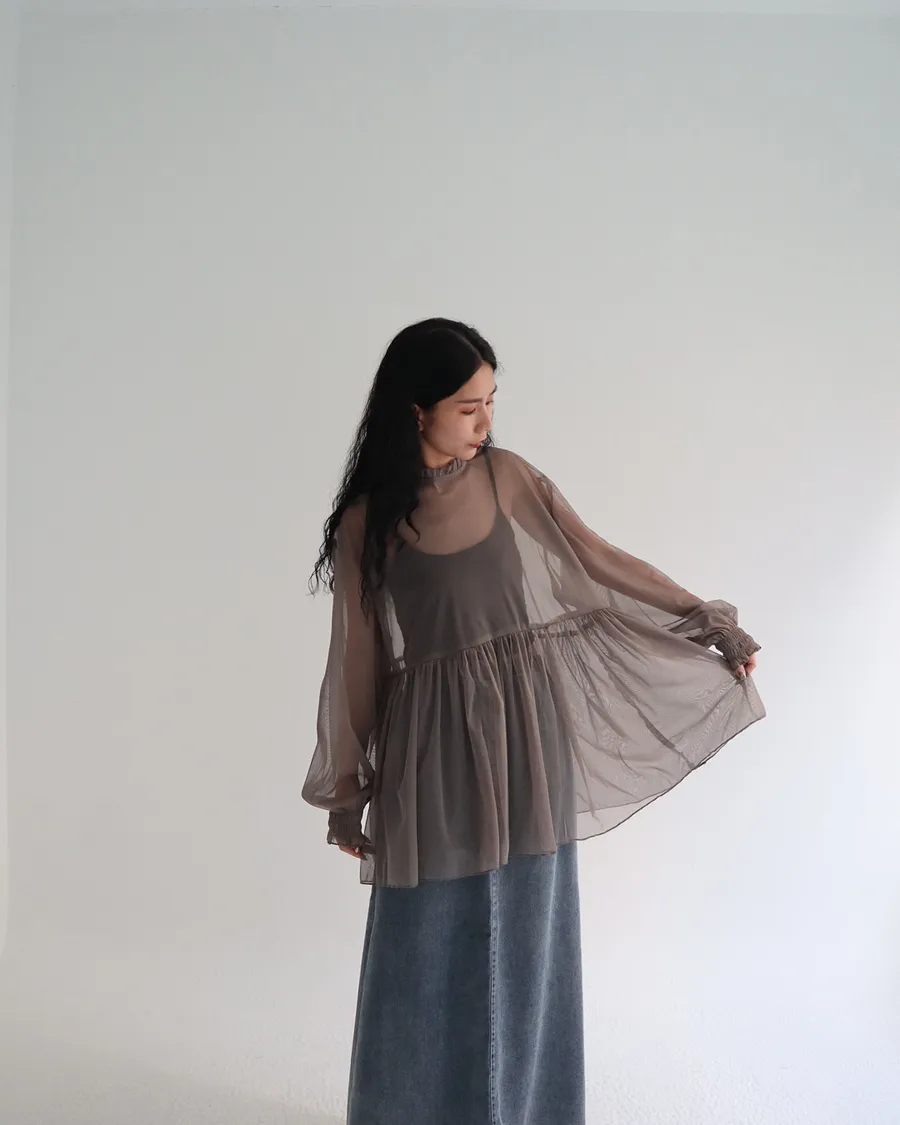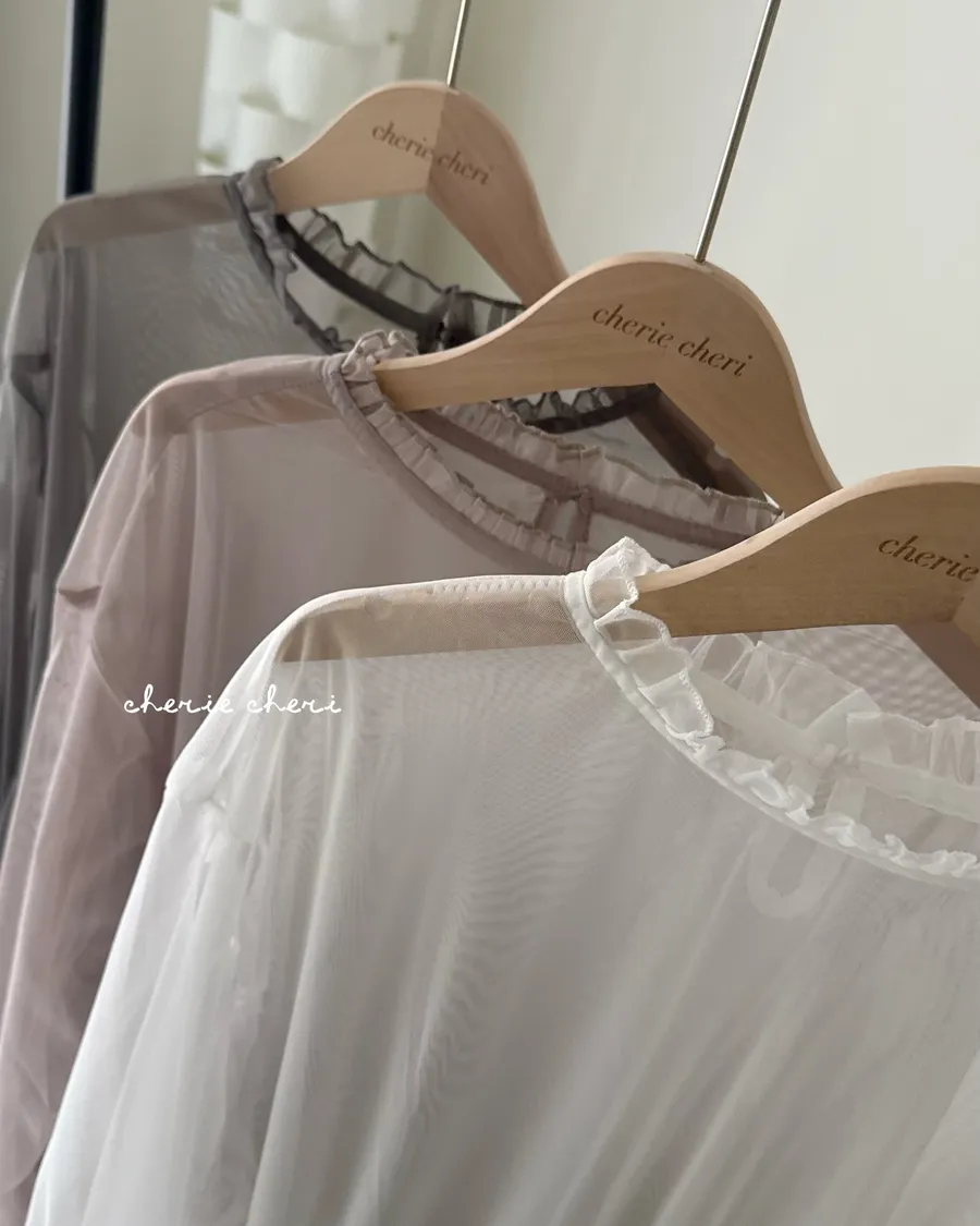 柔霧光澤木耳領透視網紗上衣 三色