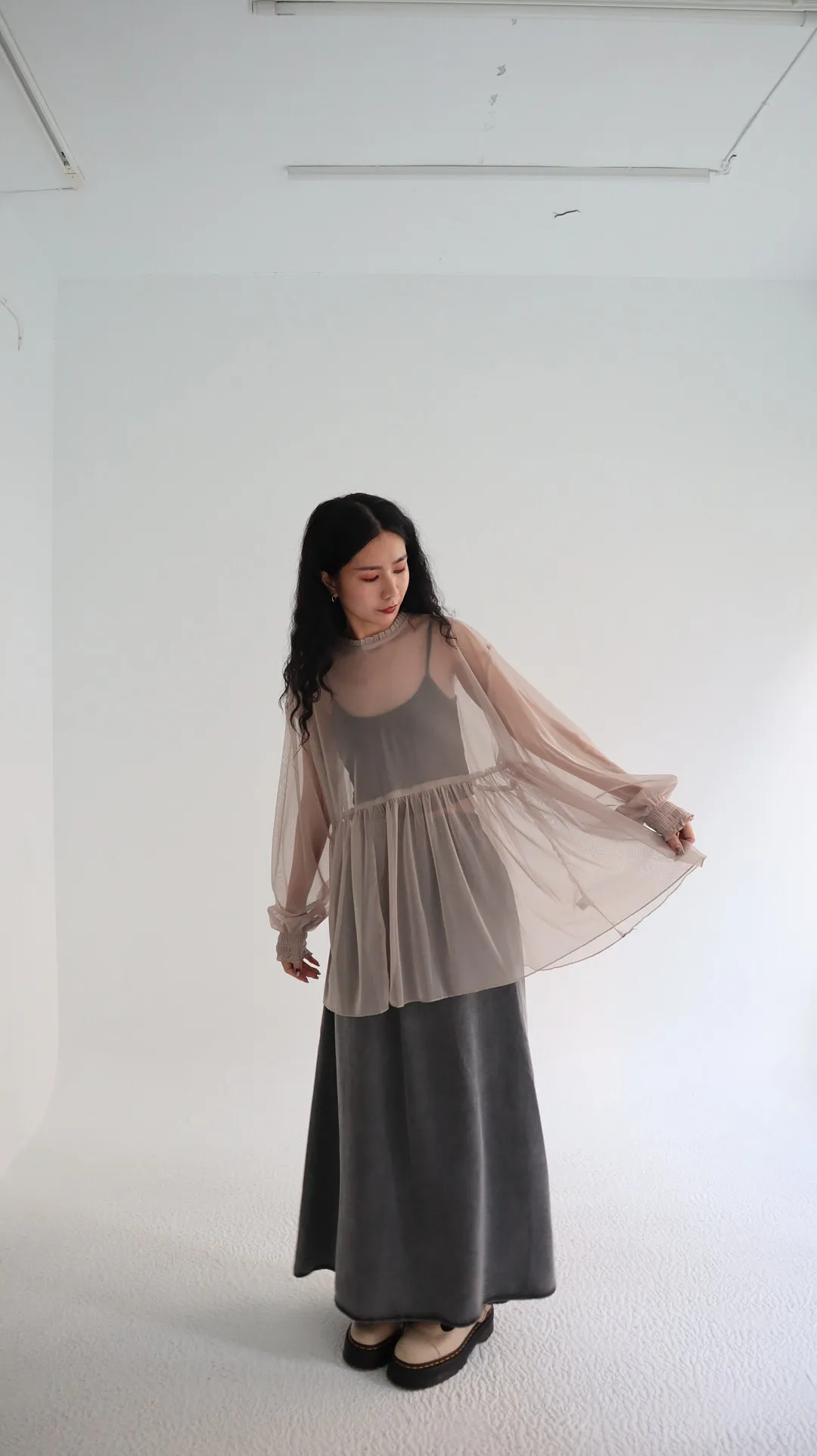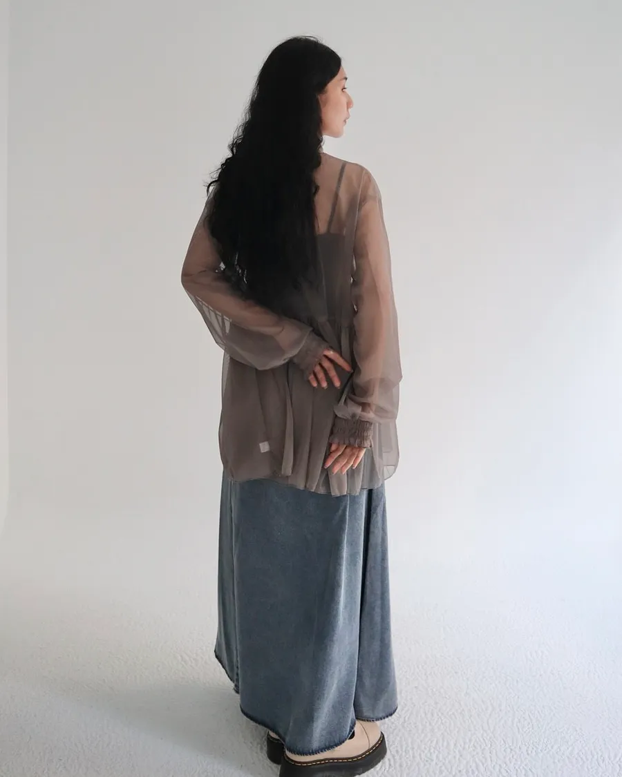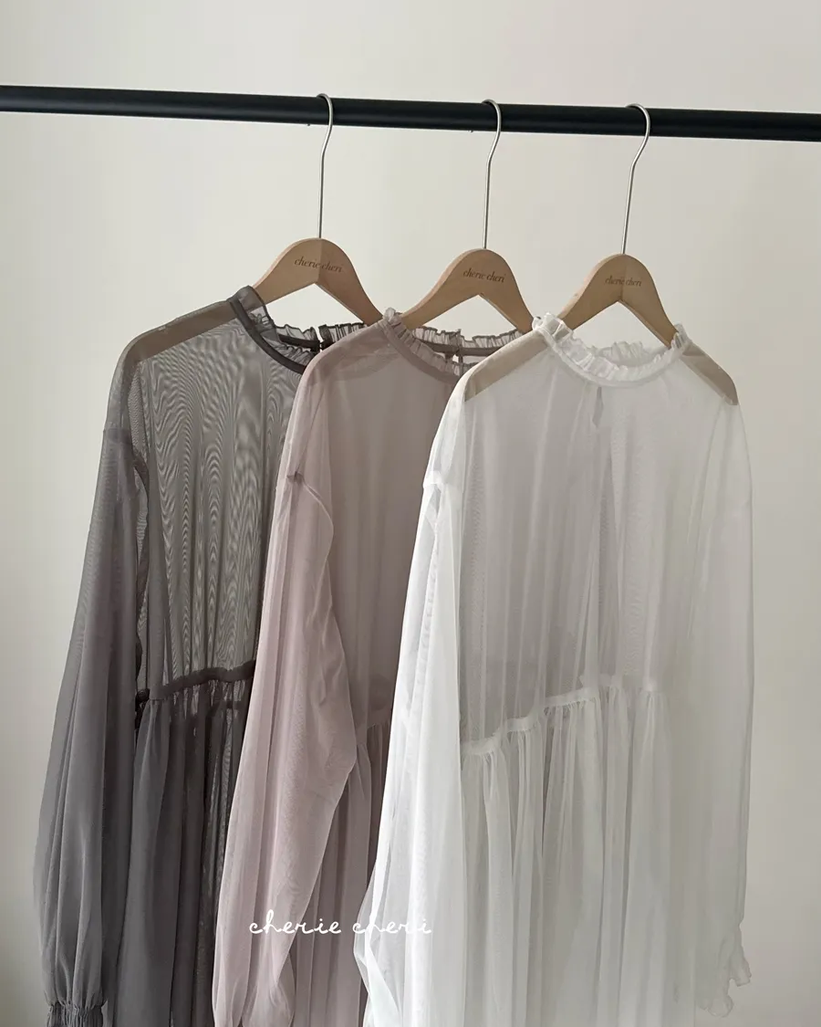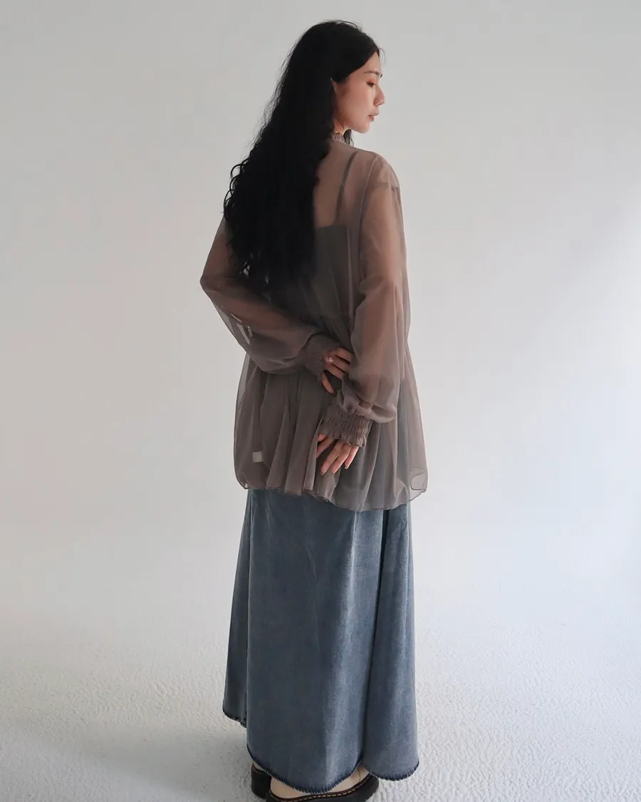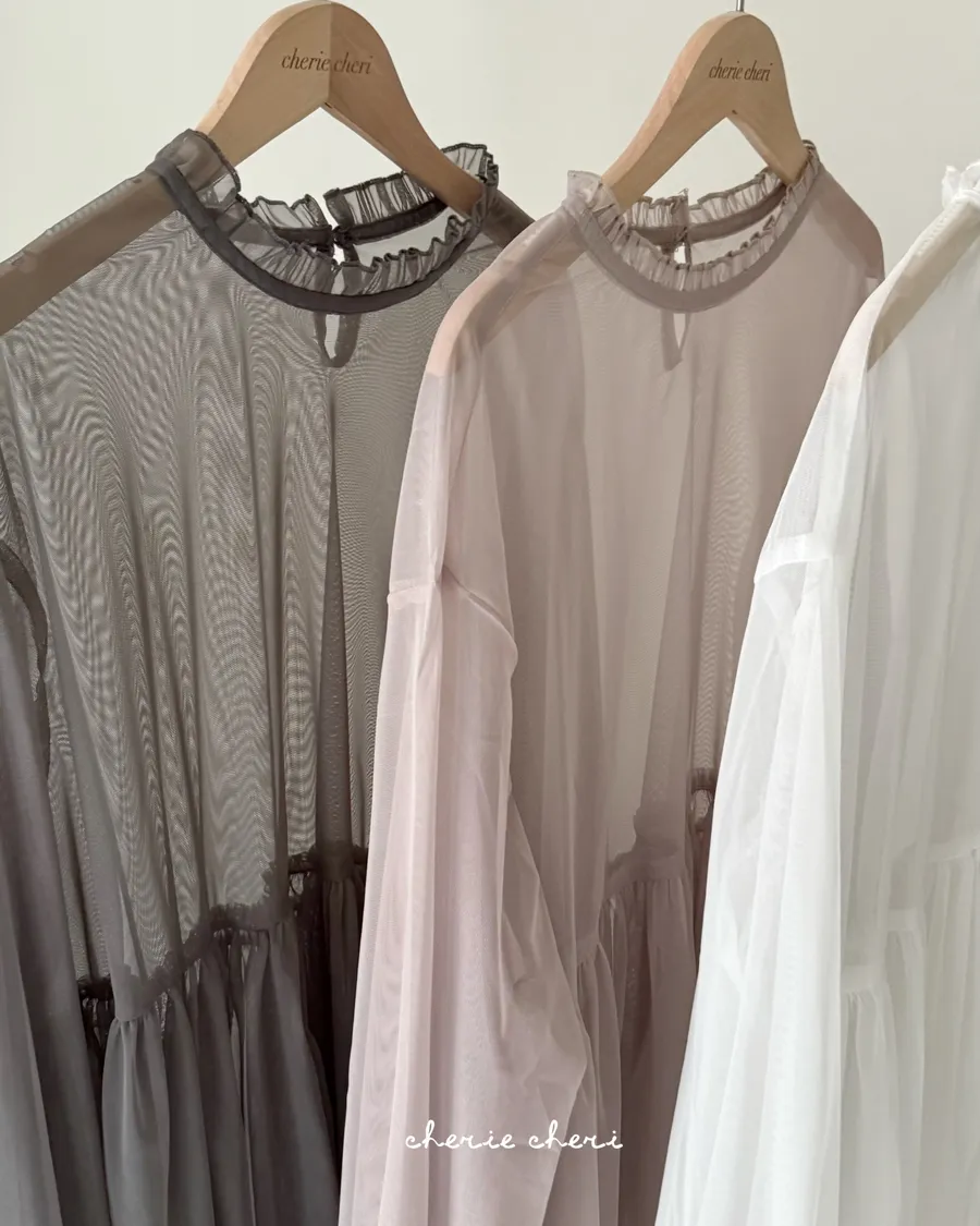 柔霧光澤木耳領透視網紗上衣 三色