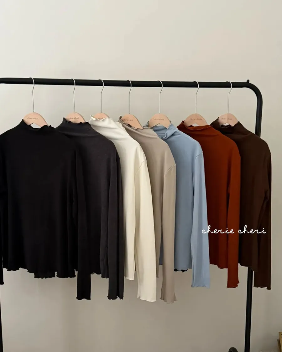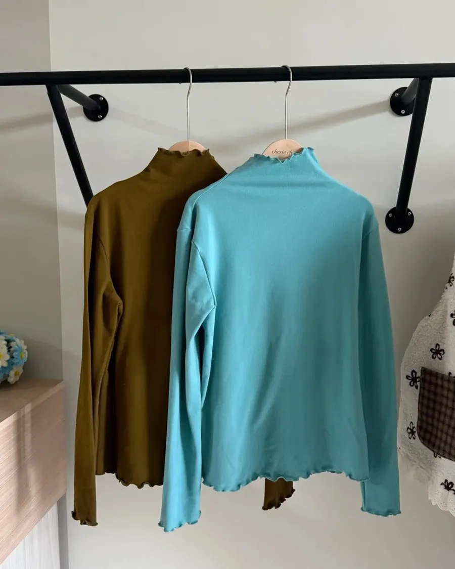 【 讓秋冬的溫暖,從一件親膚打底開始 🥐 】衣櫃裡絕對不能缺少的「木耳邊打底衫」!這款面料觸感極其柔軟,穿上像第二層肌膚般舒適。微立領的捲邊設計,讓簡約的內搭瞬間多了日系精緻感。不管是單穿搭配牛仔褲,還是疊穿在毛衣、大學 T 裡露出一點點領子,都能輕鬆打造出慵懶又不失細節的秋冬 Look。 顏色: 經典黑 / 質感灰 / 杏白 / 奶灰 / 柔霧藍/ 湖水藍/ 楓葉紅 / 焦糖咖 亮點: 波浪木耳捲邊、極致柔軟親膚、高彈力不緊繃 ------------------------------------------------------------