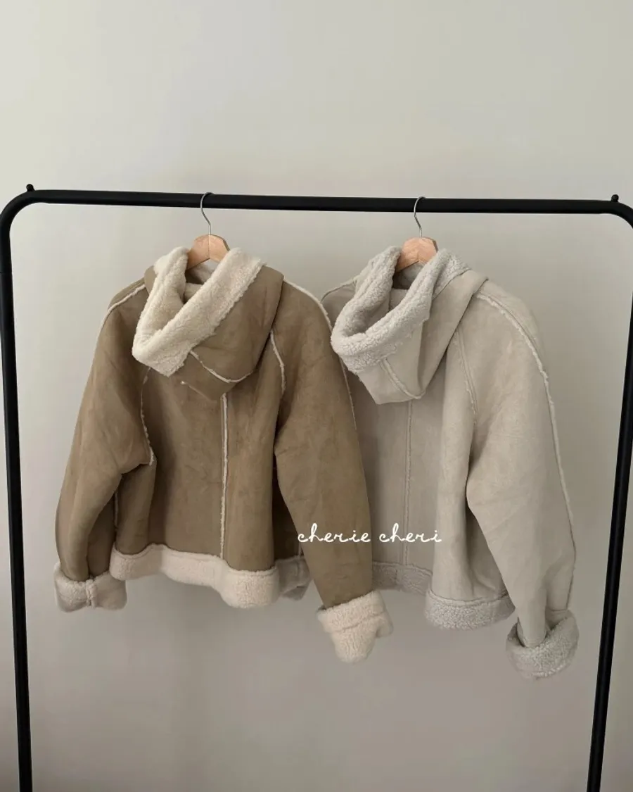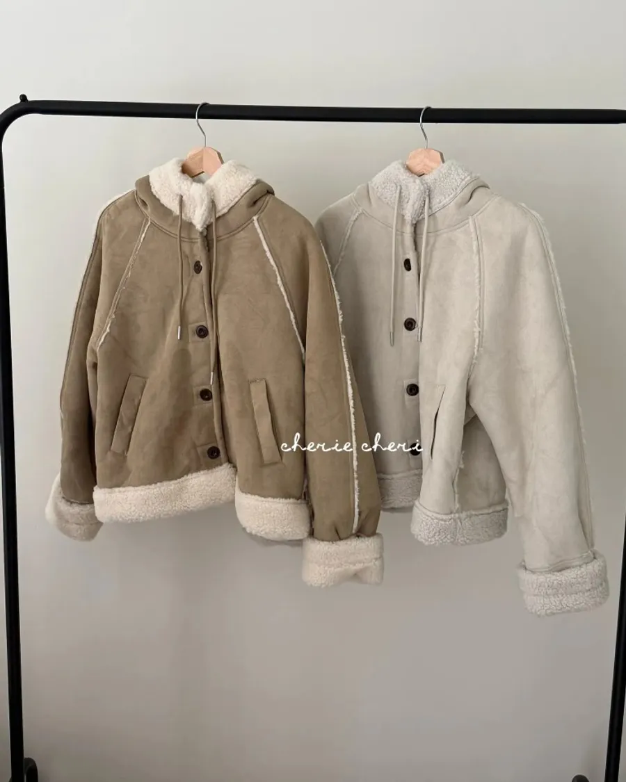 【 穿上就不想脫下的軟綿綿:麂皮羊羔絨連帽外套 🧶 】冬天的保暖與時髦,這件一次給妳!外層是質感的麂皮絨,內裡拼接了超軟萌的羊羔毛,手感紮實且抗風效果極佳。連帽設計配上領口露出的白色絨毛,穿起來整個人都溫柔了起來。不管是搭配牛仔褲走帥氣感,還是搭碎花長裙走日系甜美風都非常合適 ✨ 亮點: 重磅麂皮絨、連帽抽繩設計、拼接羊羔毛 ------------------------------------------------------------