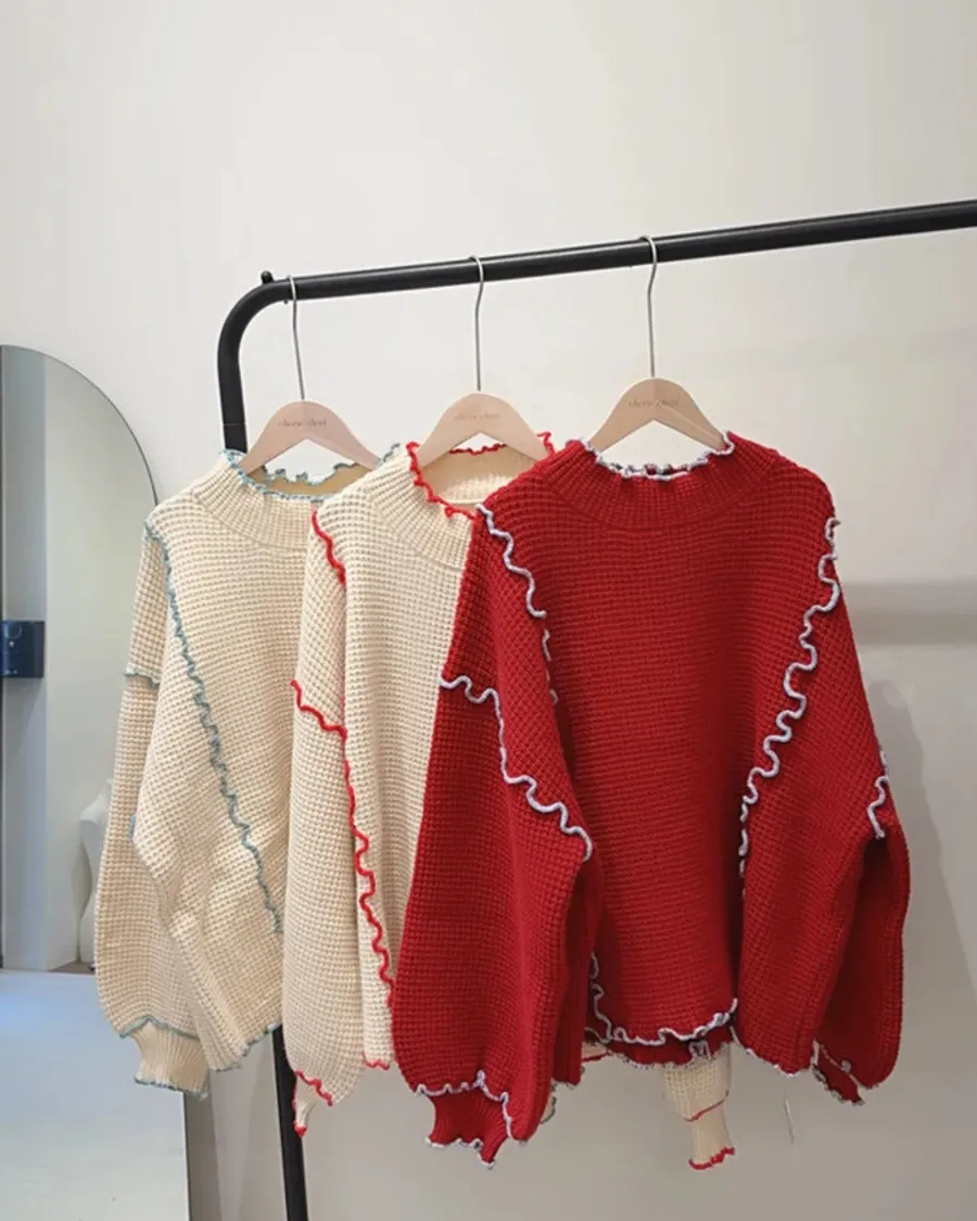 【 把冬天的立體層次,穿在身上:撞色滾邊鬆餅格毛衣 】簡約中帶點不平凡的日系設計感。這款毛衣採用了手感紮實的鬆餅格織法,布面充滿細膩的凹凸紋理。最吸睛的莫過於那一圈圈立體的撞色木耳邊,從領口一路延續到袖口,讓素色毛衣瞬間充滿動感 ✨ 微立領設計不僅修飾頸部線條,還能抵擋冬日的微風。 亮點: 立體撞色木耳邊、鬆餅格親絨面料、燈籠澎澎袖 ------------------------------------------------------------