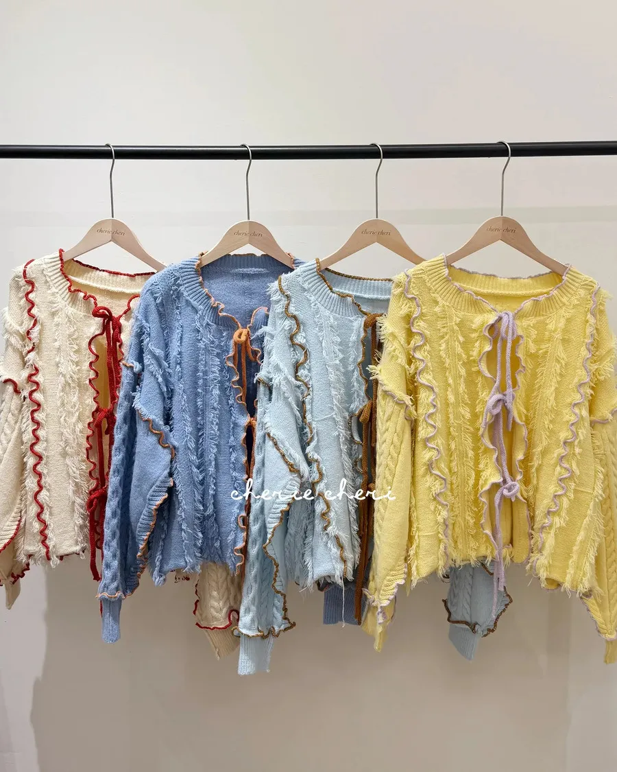 【 讓穿搭多一點靈動:滿滿細節流蘇綁結外搭 🩰 】這款外搭真的如其名,細節感滿分!經典的麻花編織基底,配上領口與衣身邊緣的立體流蘇捲邊,讓整體層次豐富又不失輕盈。最迷人的三個蝴蝶結綁帶設計,可以隨心情調整開合度,內搭一件透膚蕾絲或是簡約洋裝,就能穿出甜美又高級的日系氛圍。 亮點: 撞色考克邊流蘇、三段式綁帶設計、精緻麻花紋路 ------------------------------------------------------------