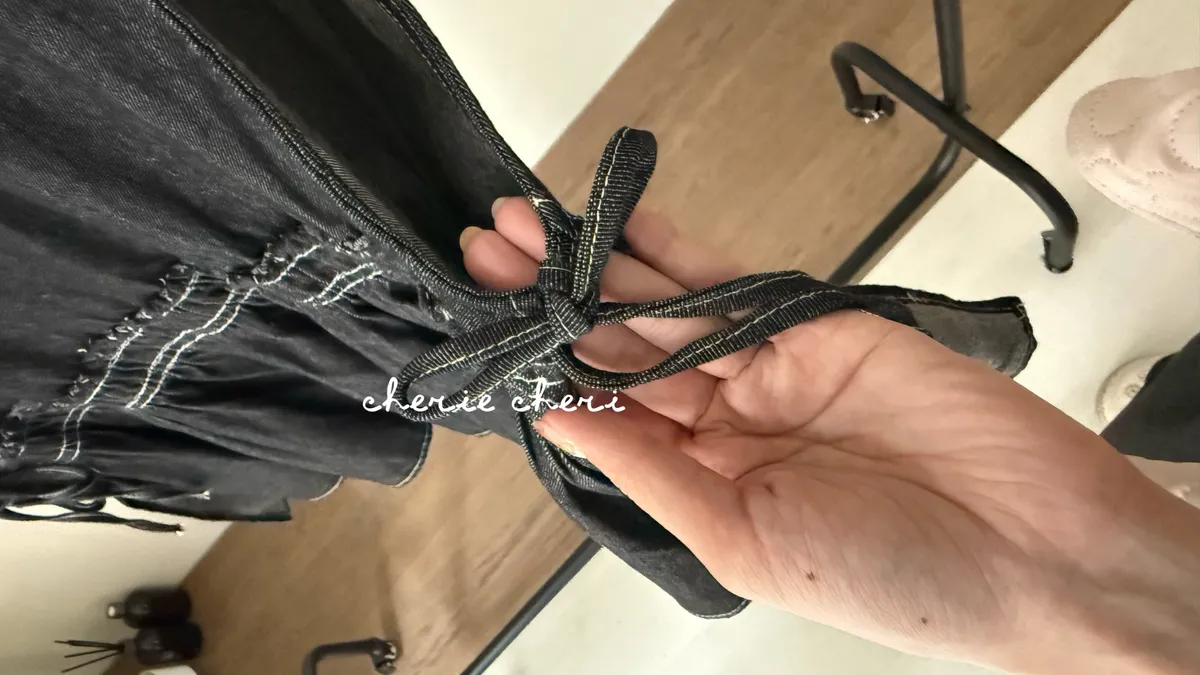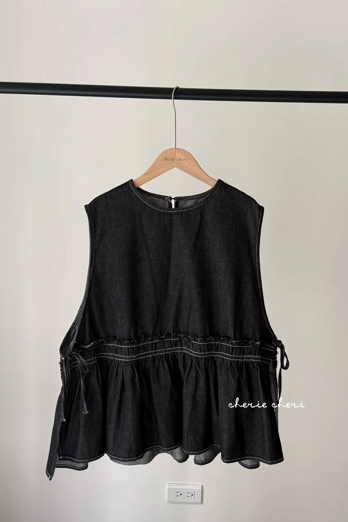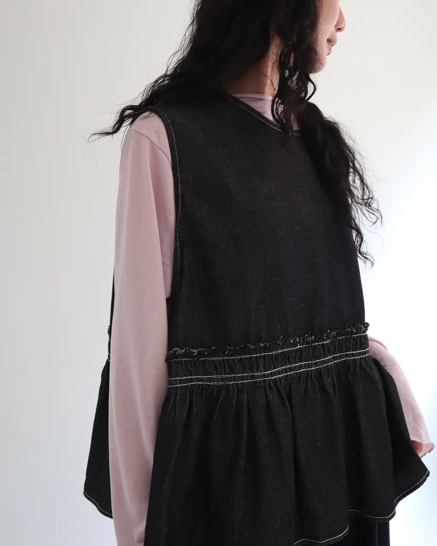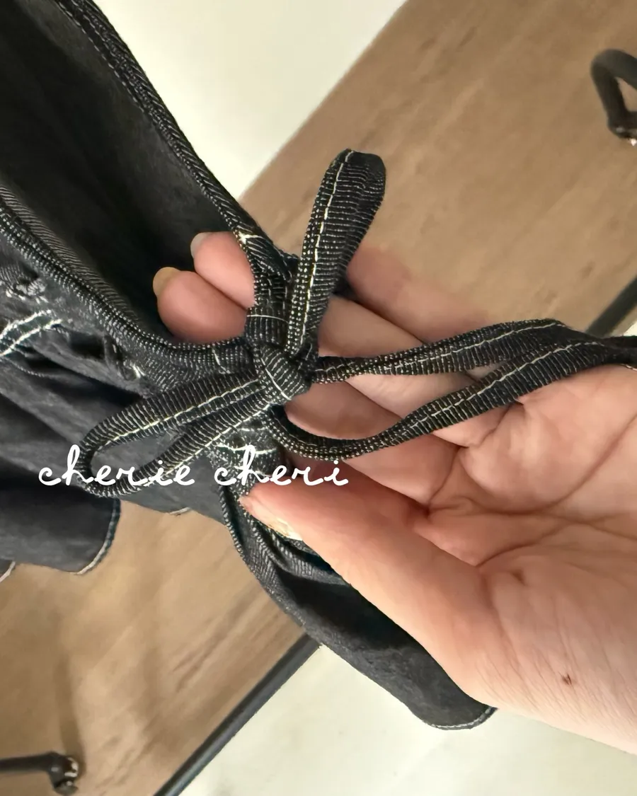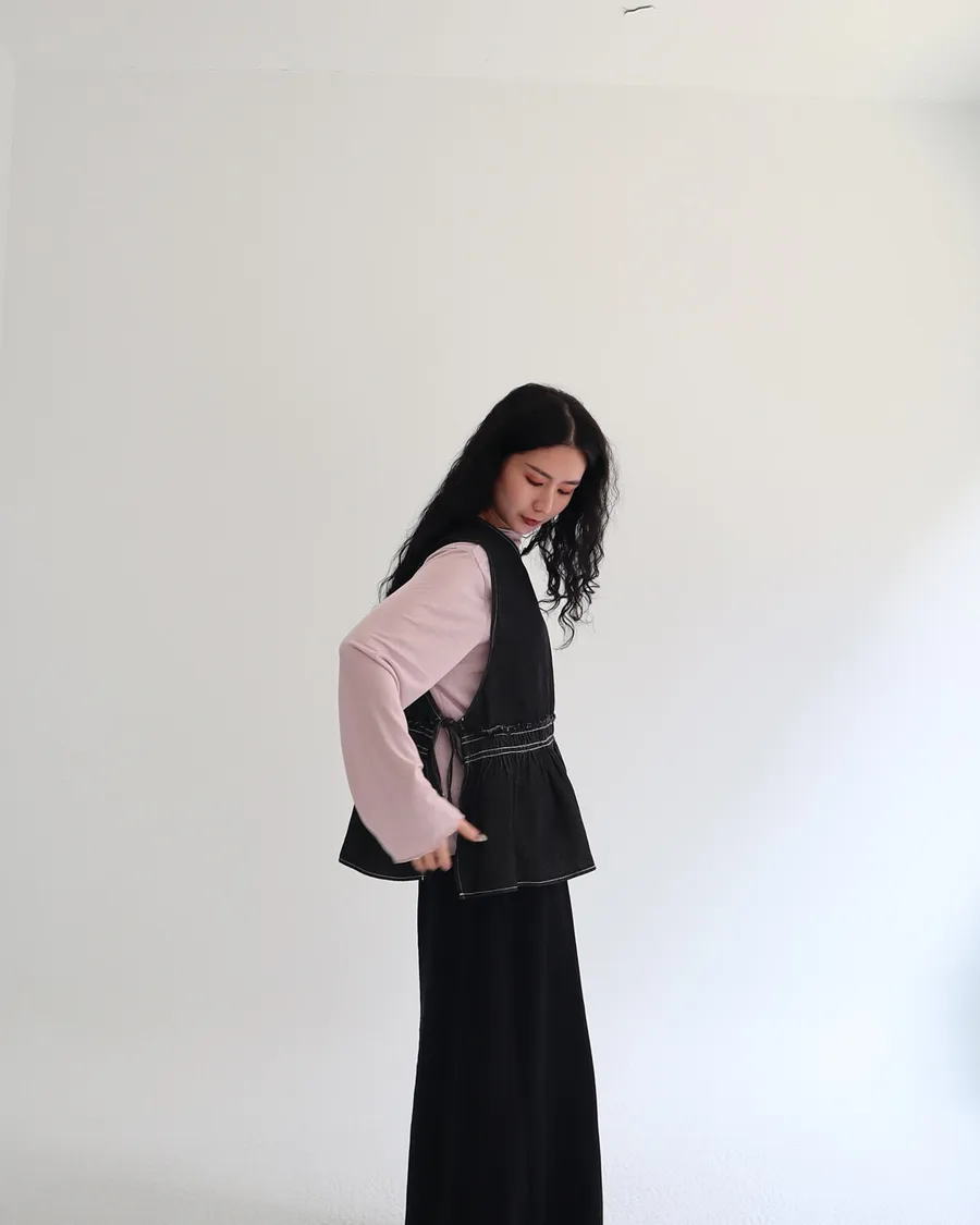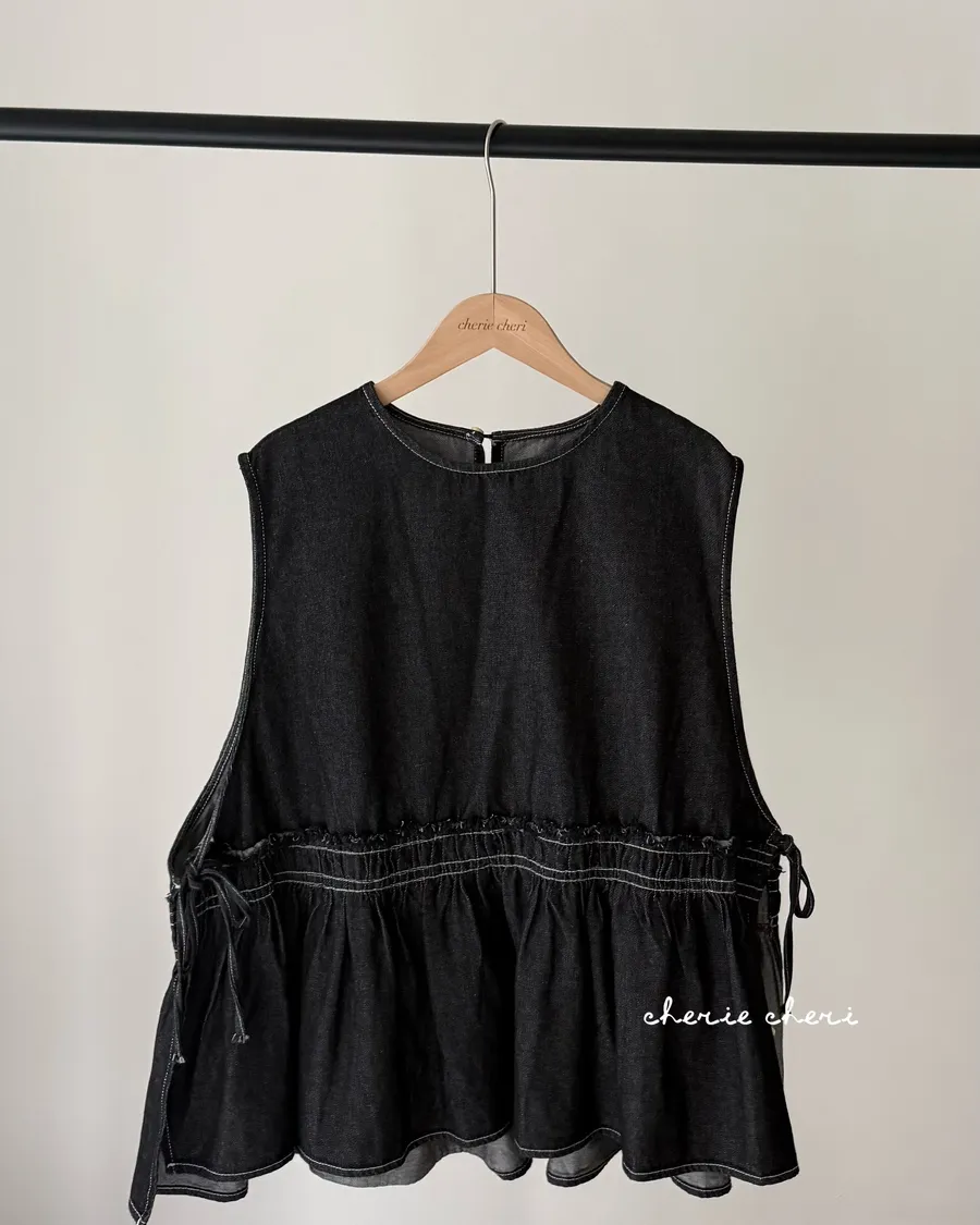 設計感側綁帶抽褶牛仔背心