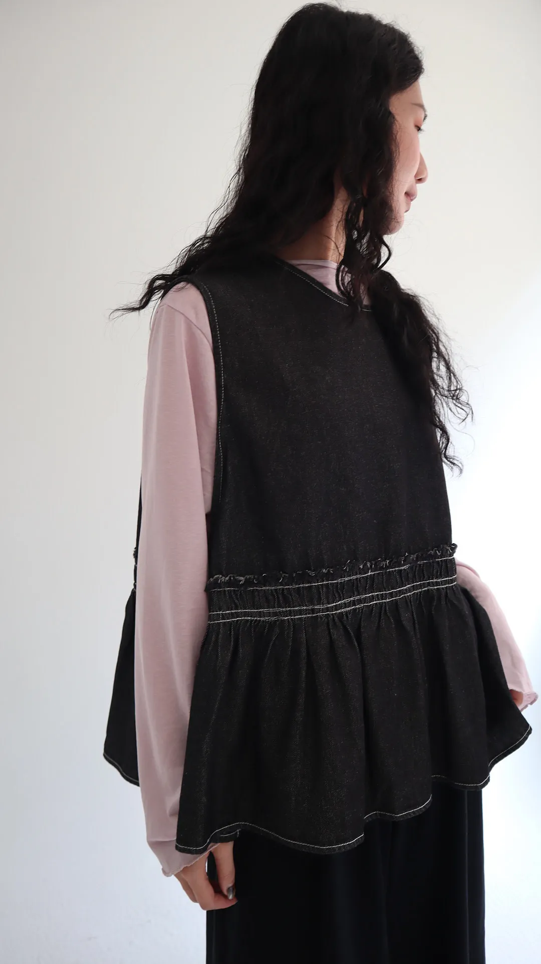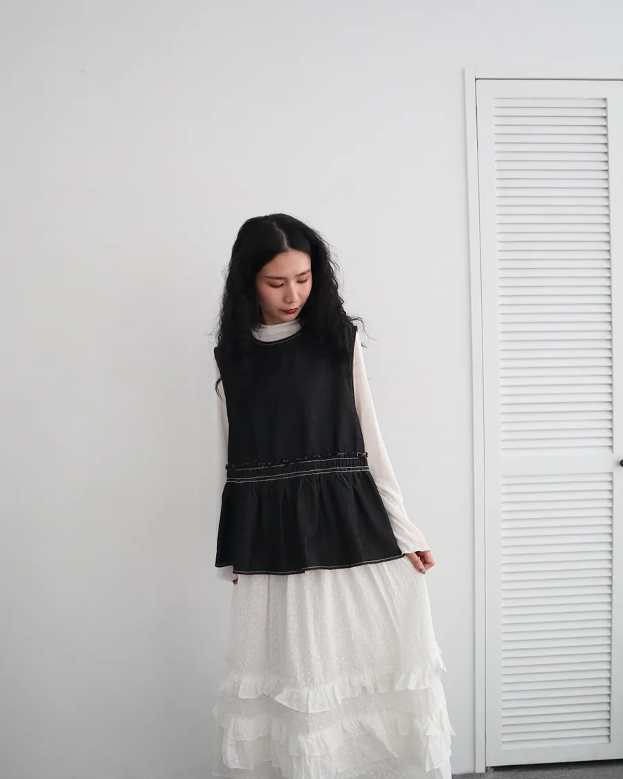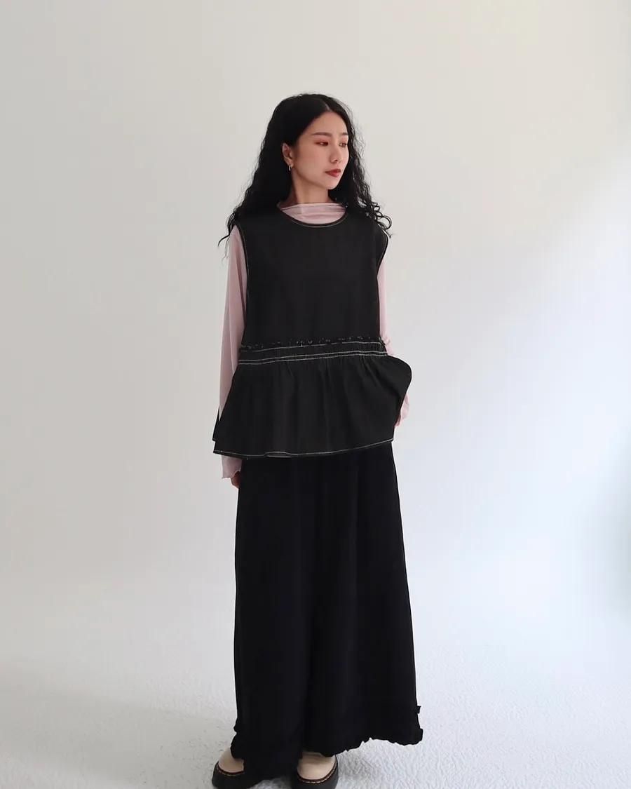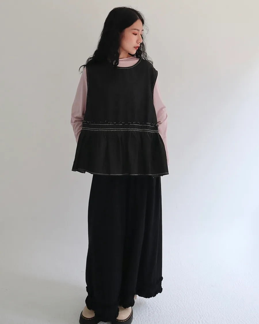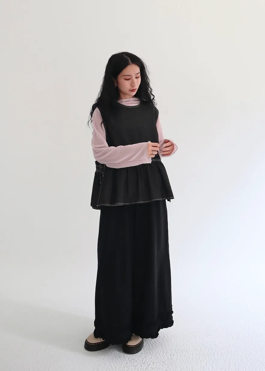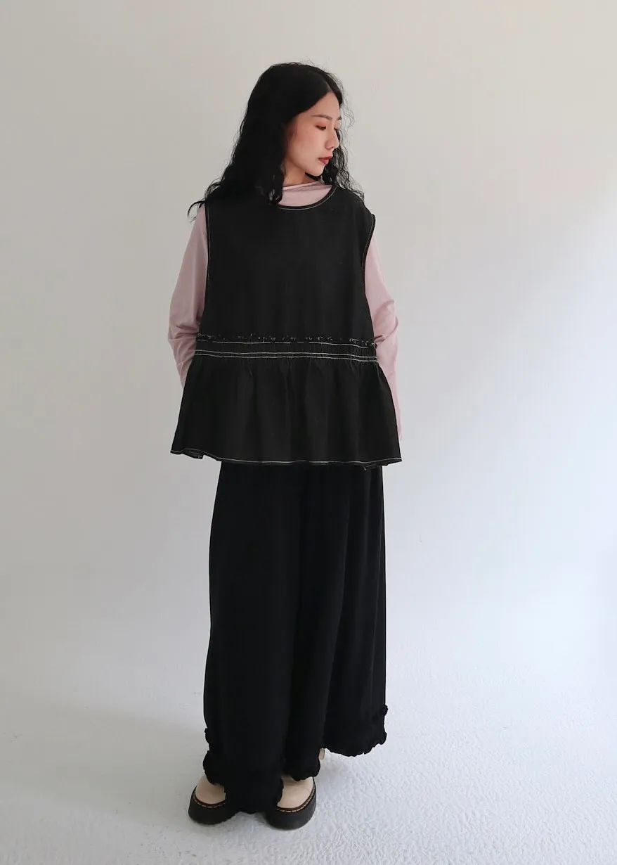 設計感側綁帶抽褶牛仔背心