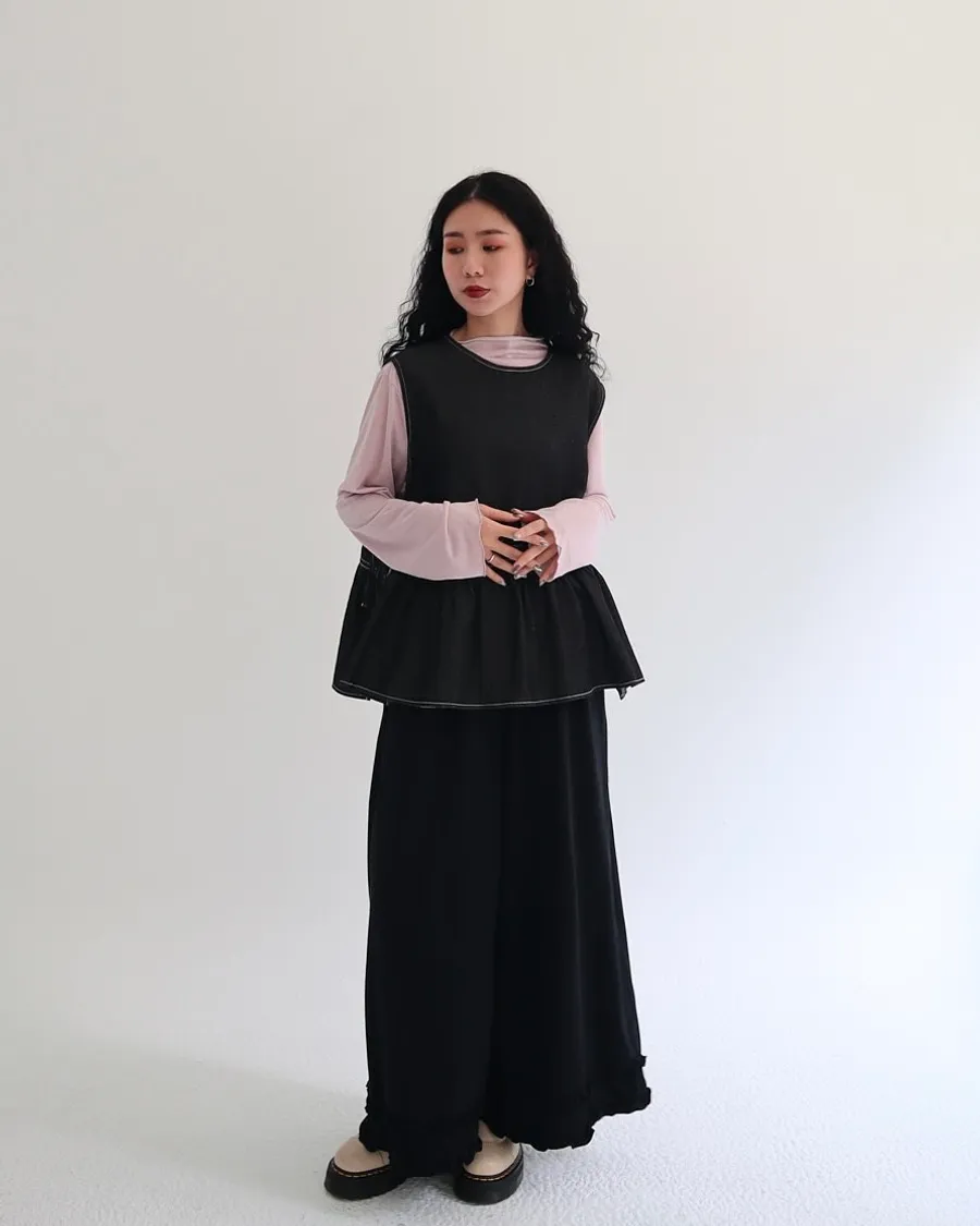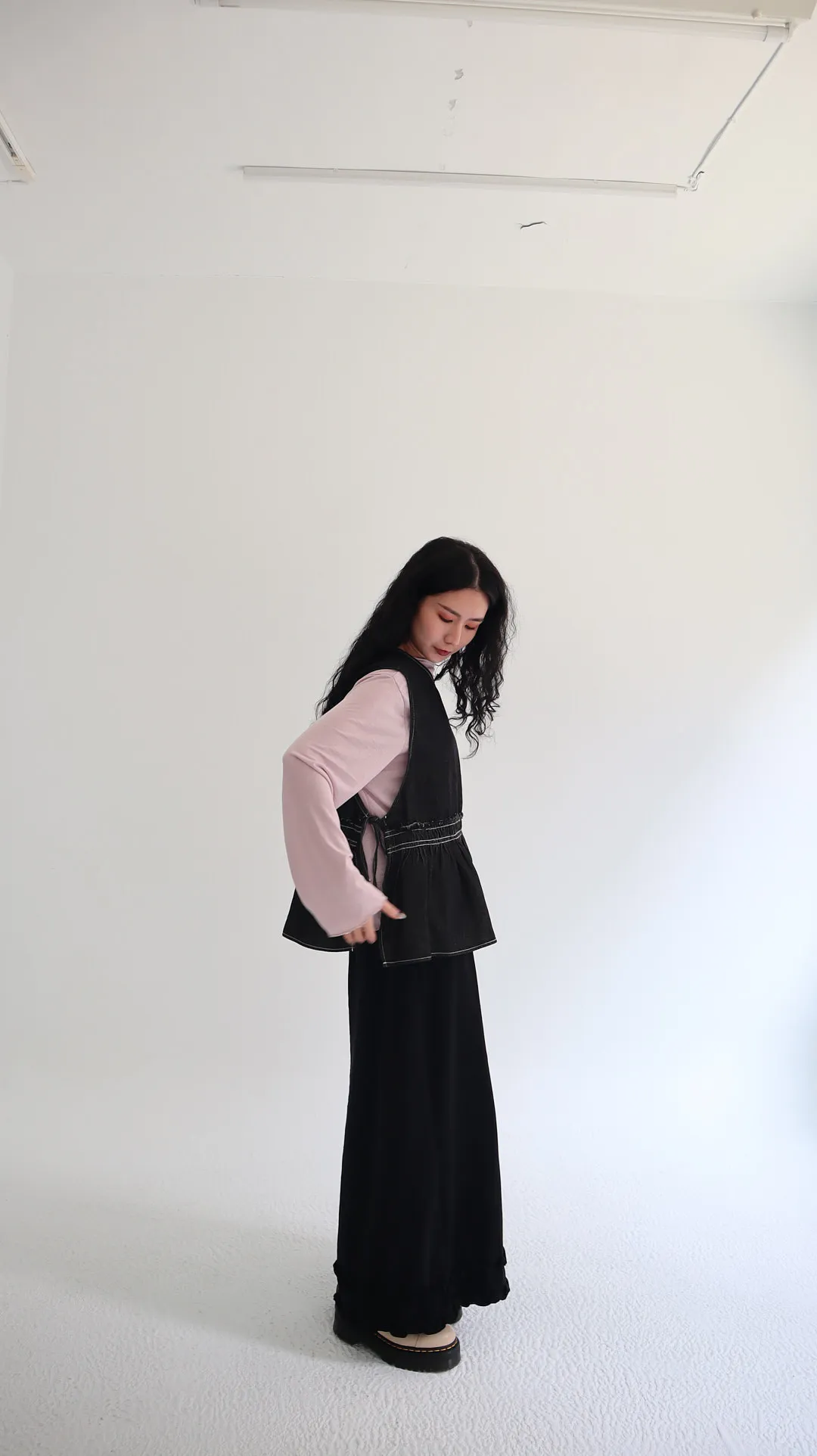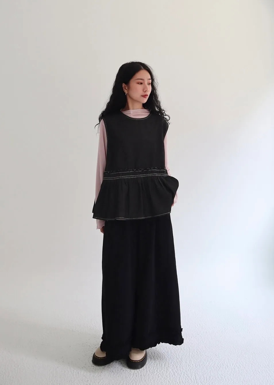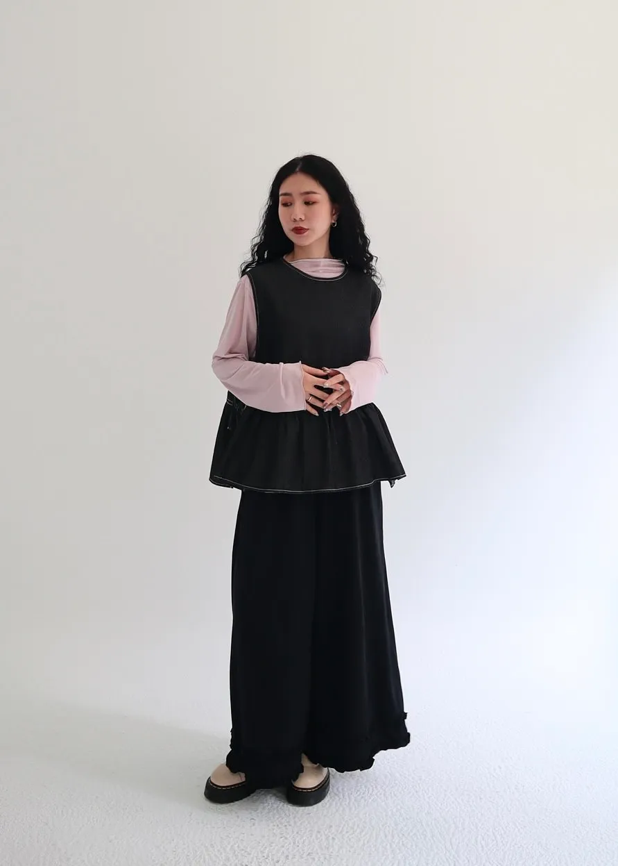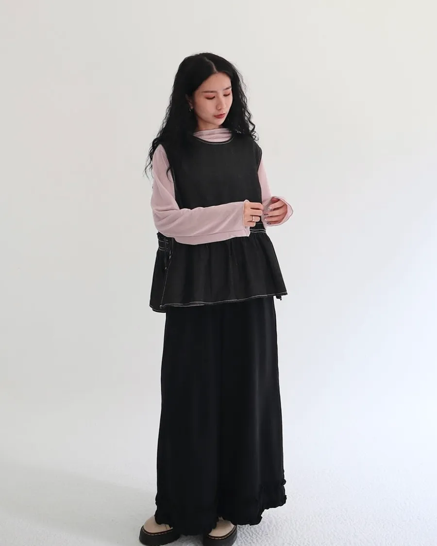 設計感側綁帶抽褶牛仔背心